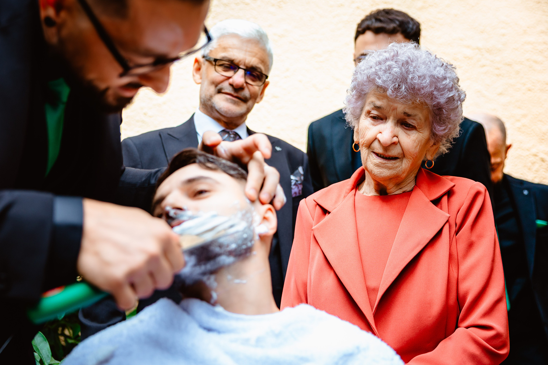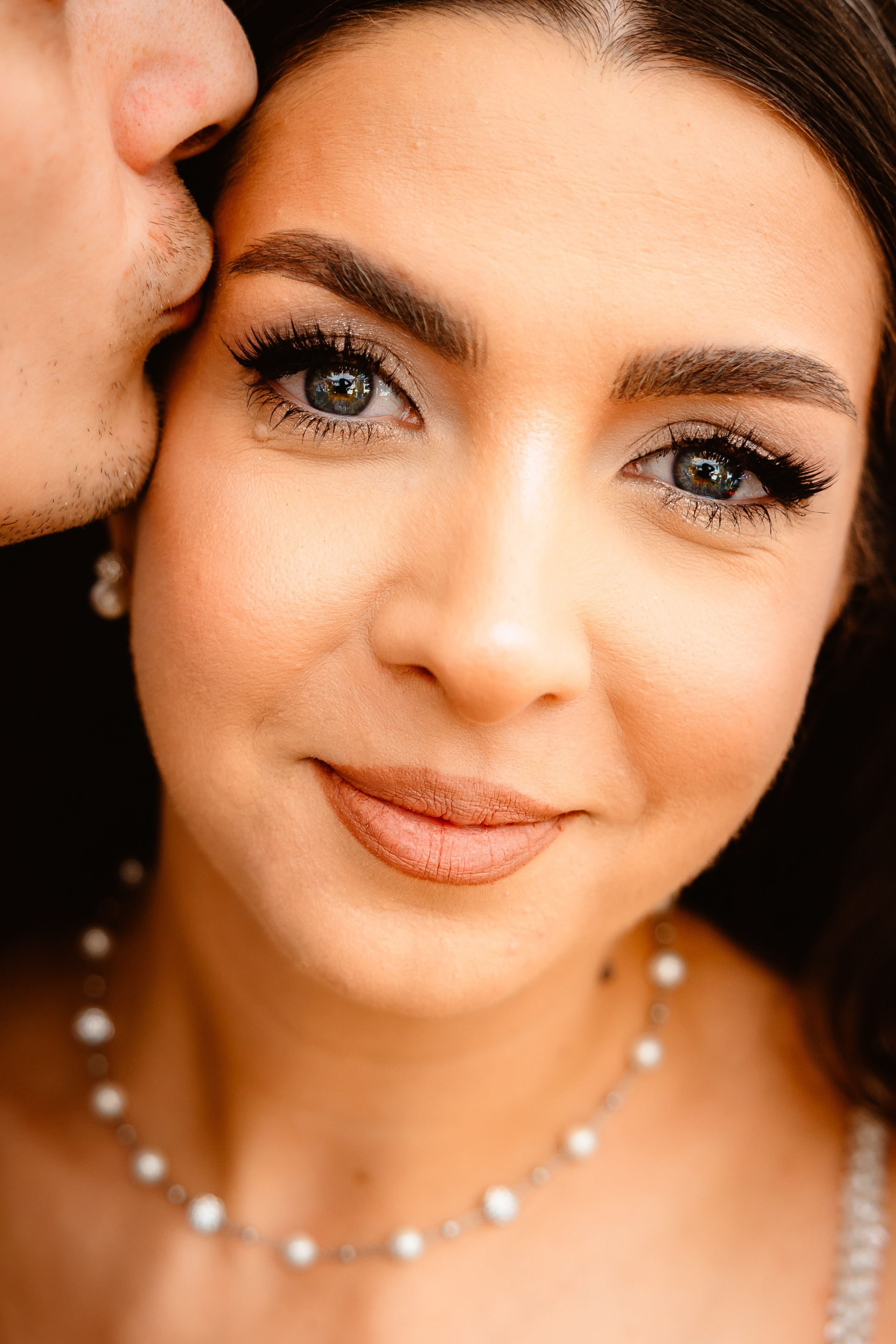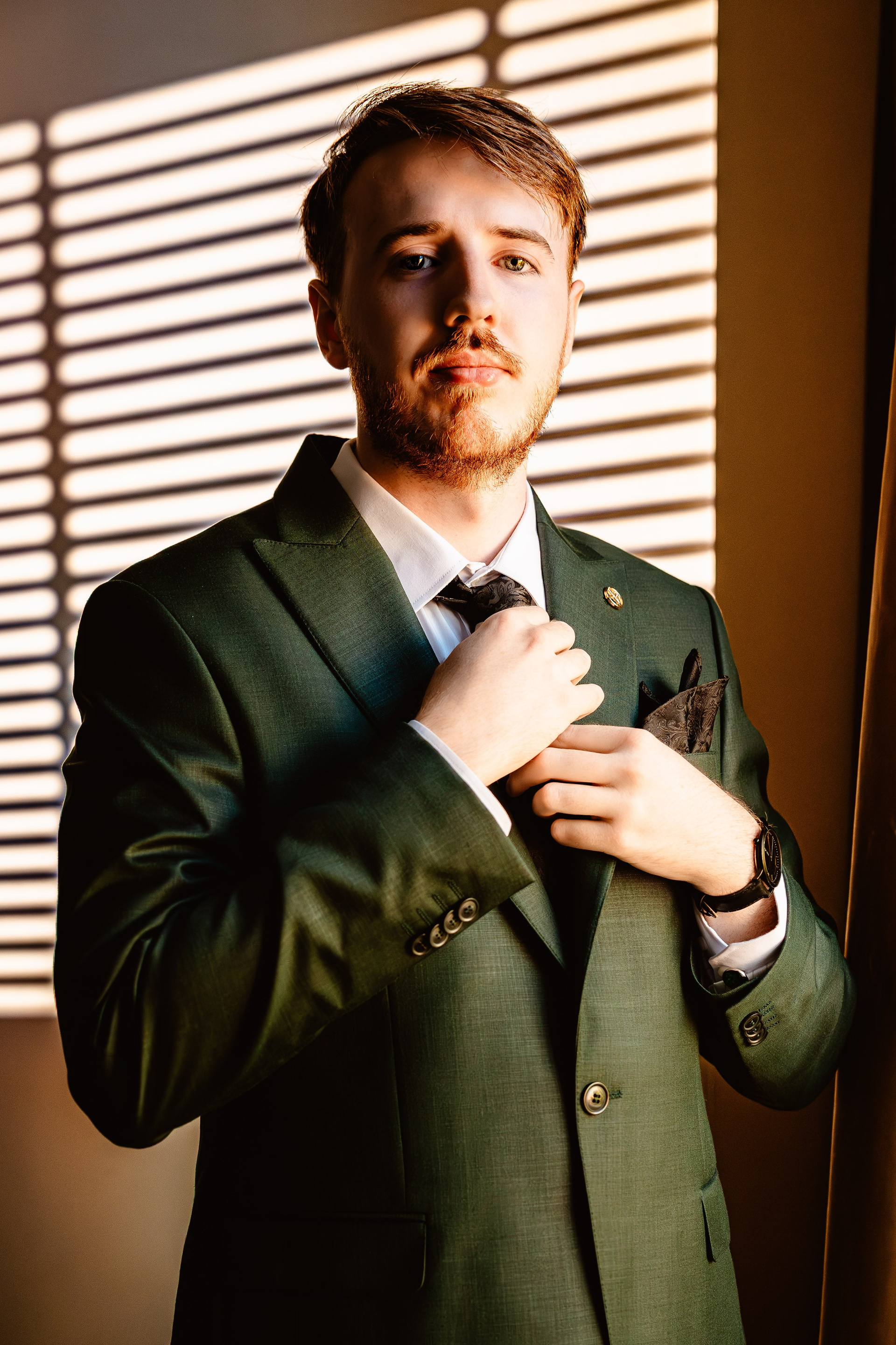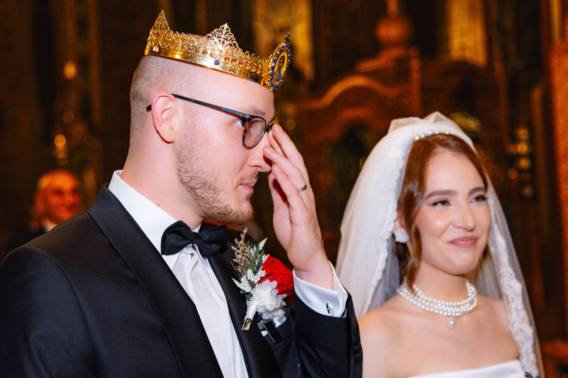 Portret de mire cu fundal marmorat în tonuri calde, privire laterală