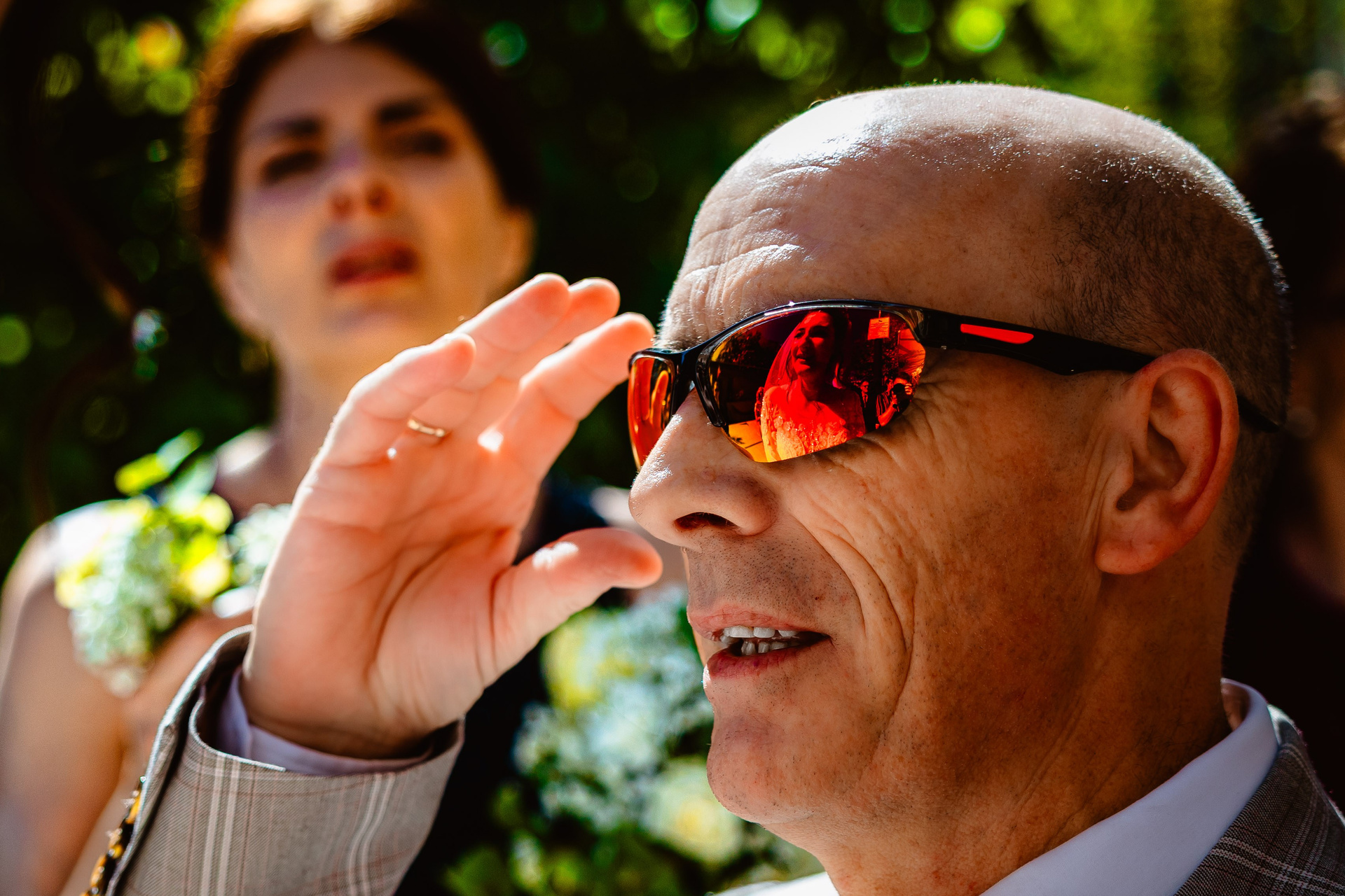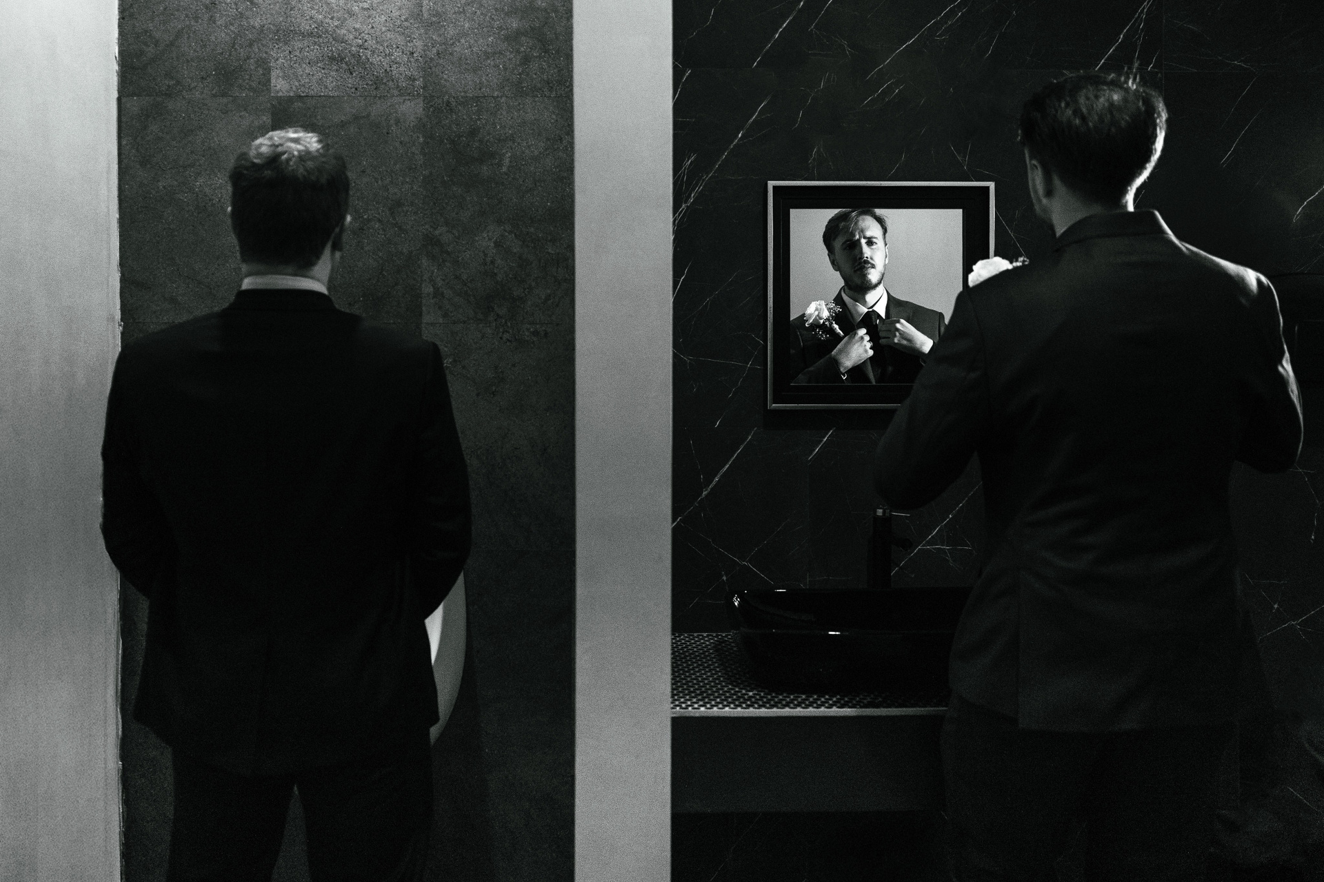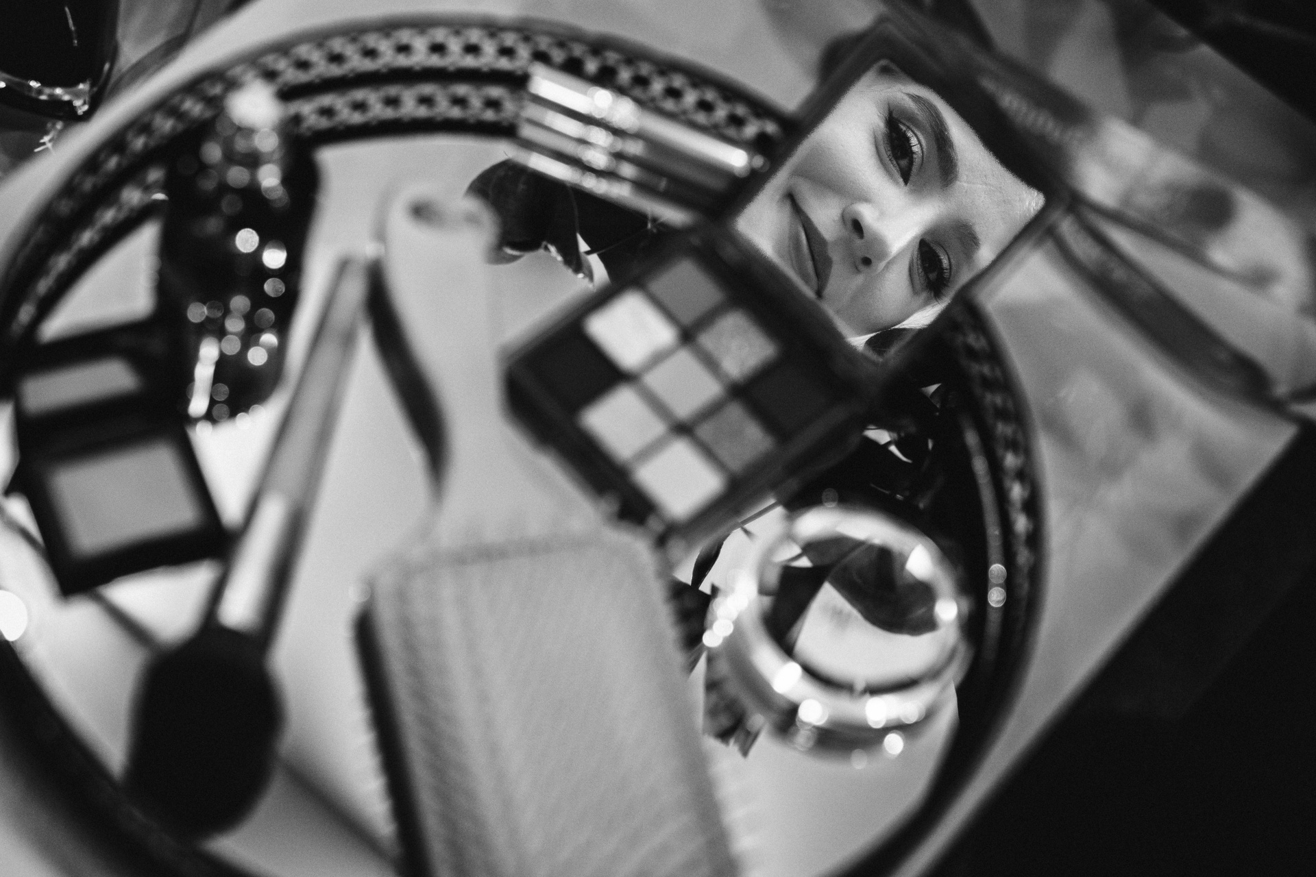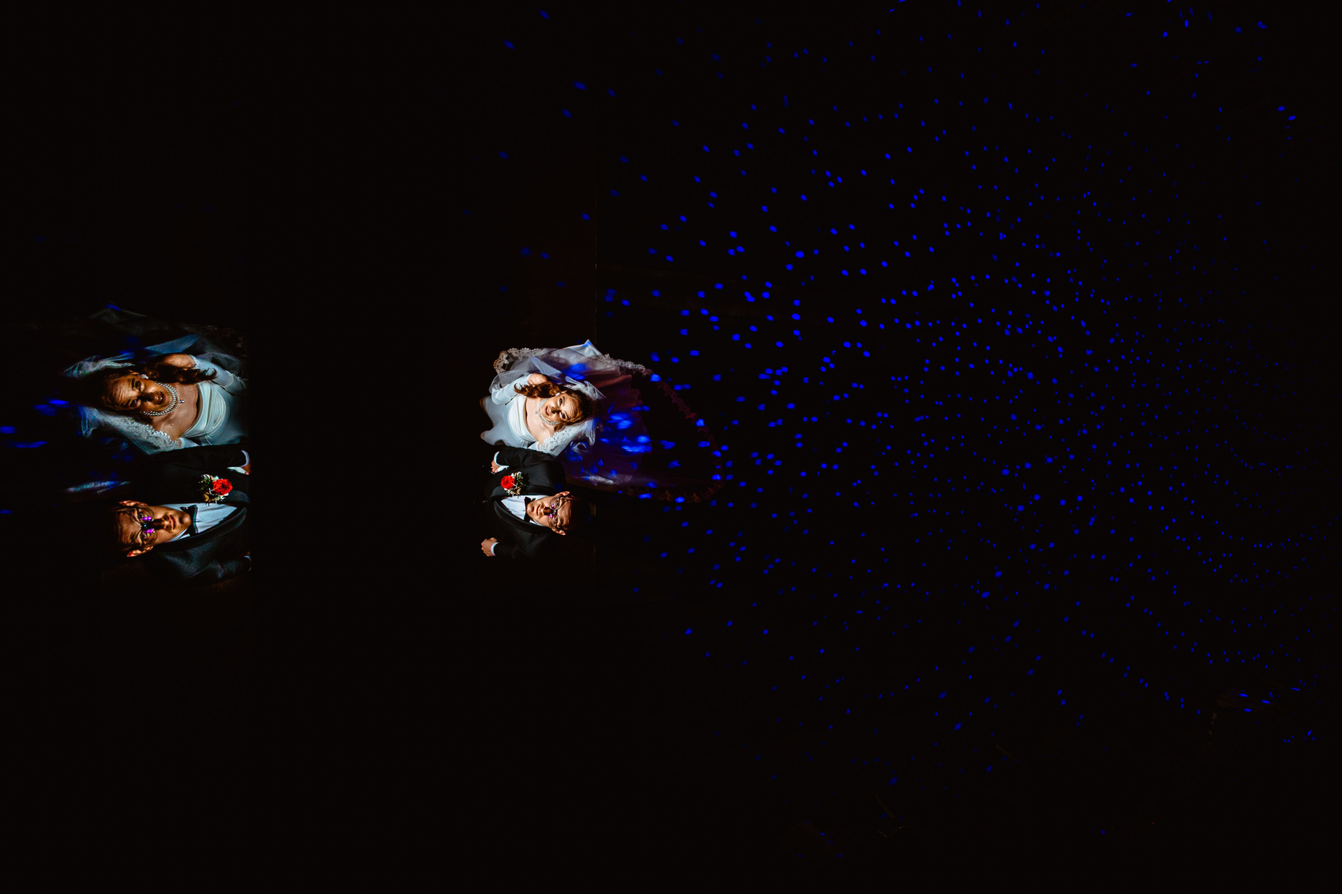 Reflexie artistică cu mireasa în oglindă, efect dramatic de lumină