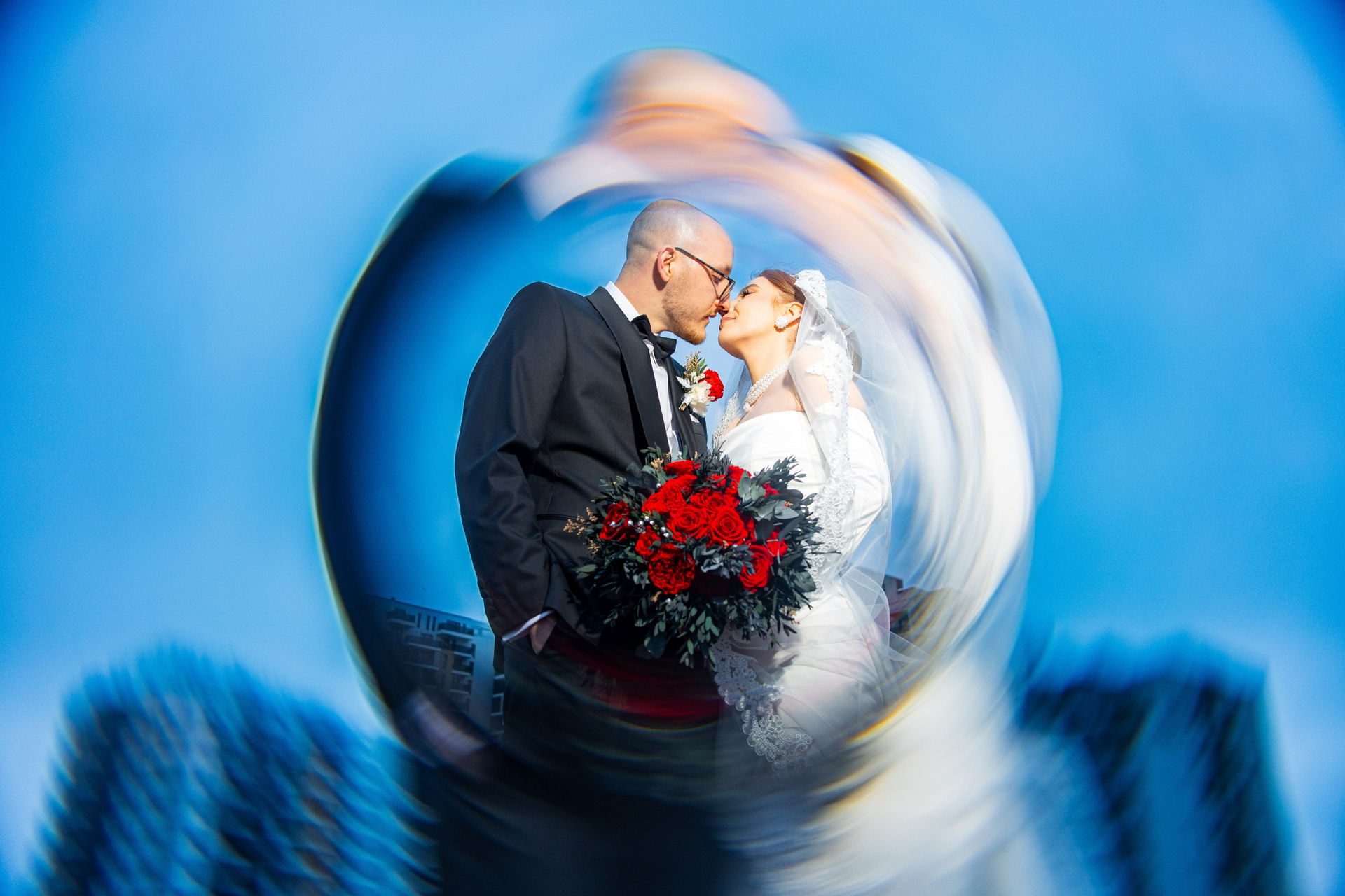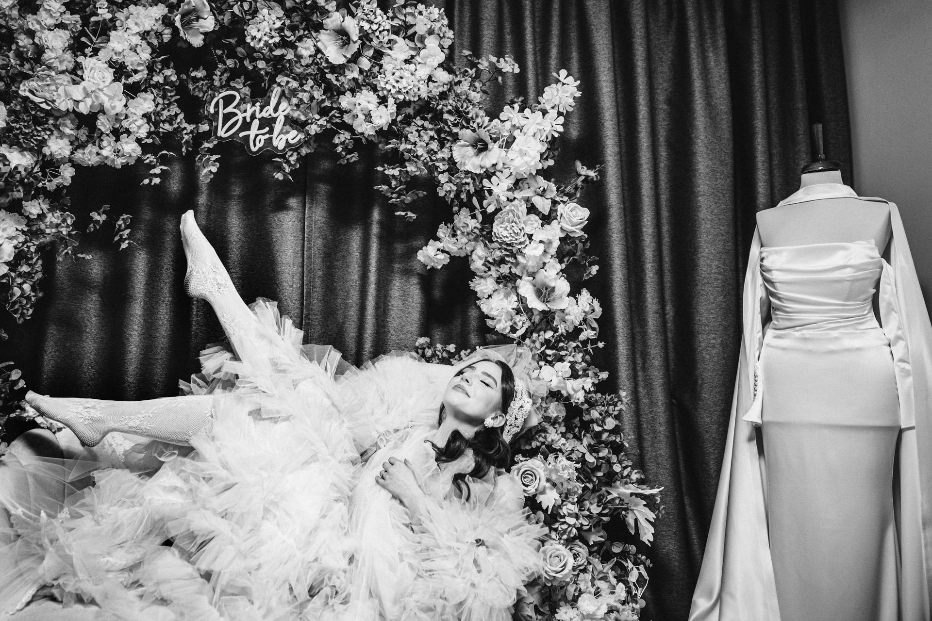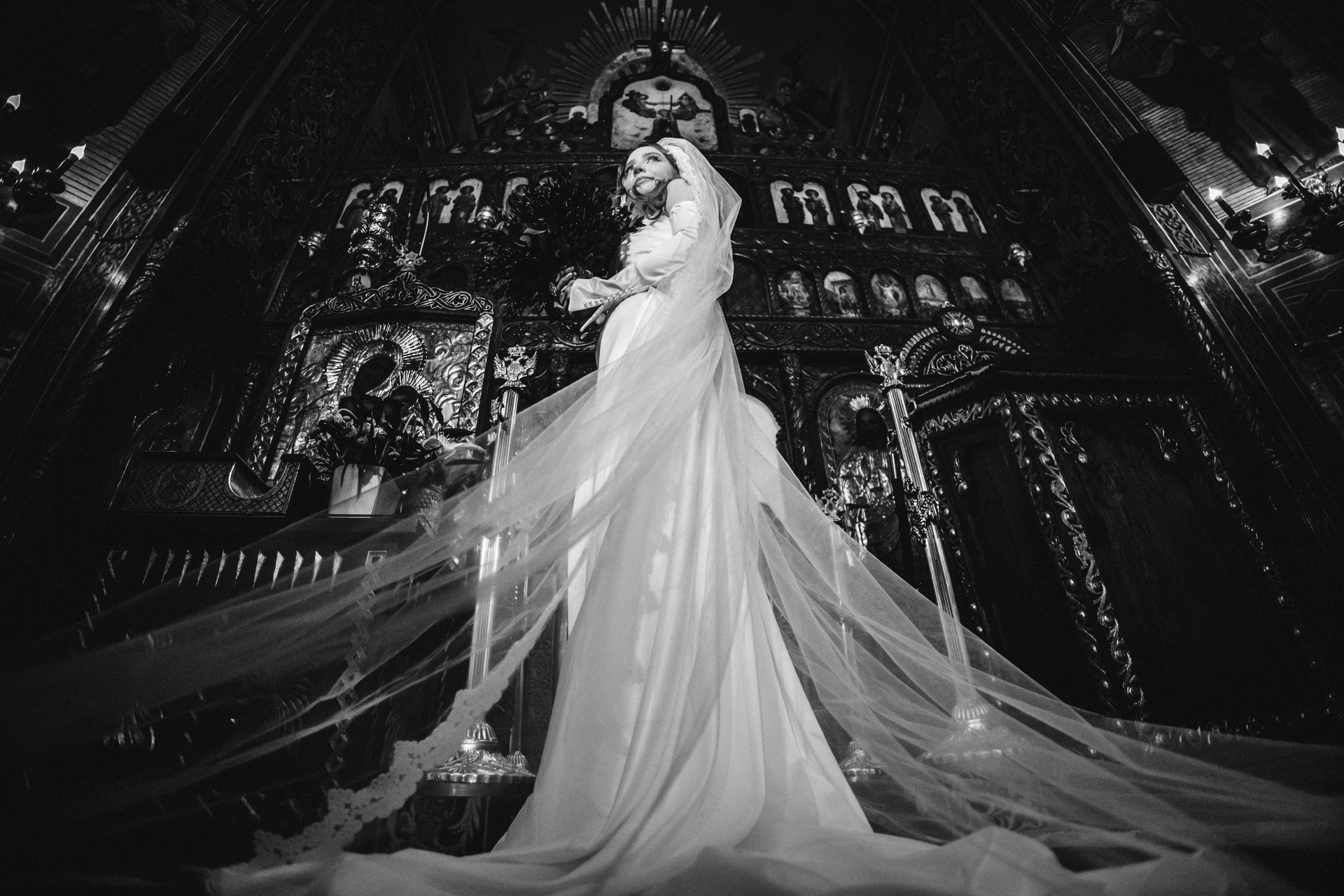 Mireasă învăluită în voal, mișcare artistică capturată în alb-negru