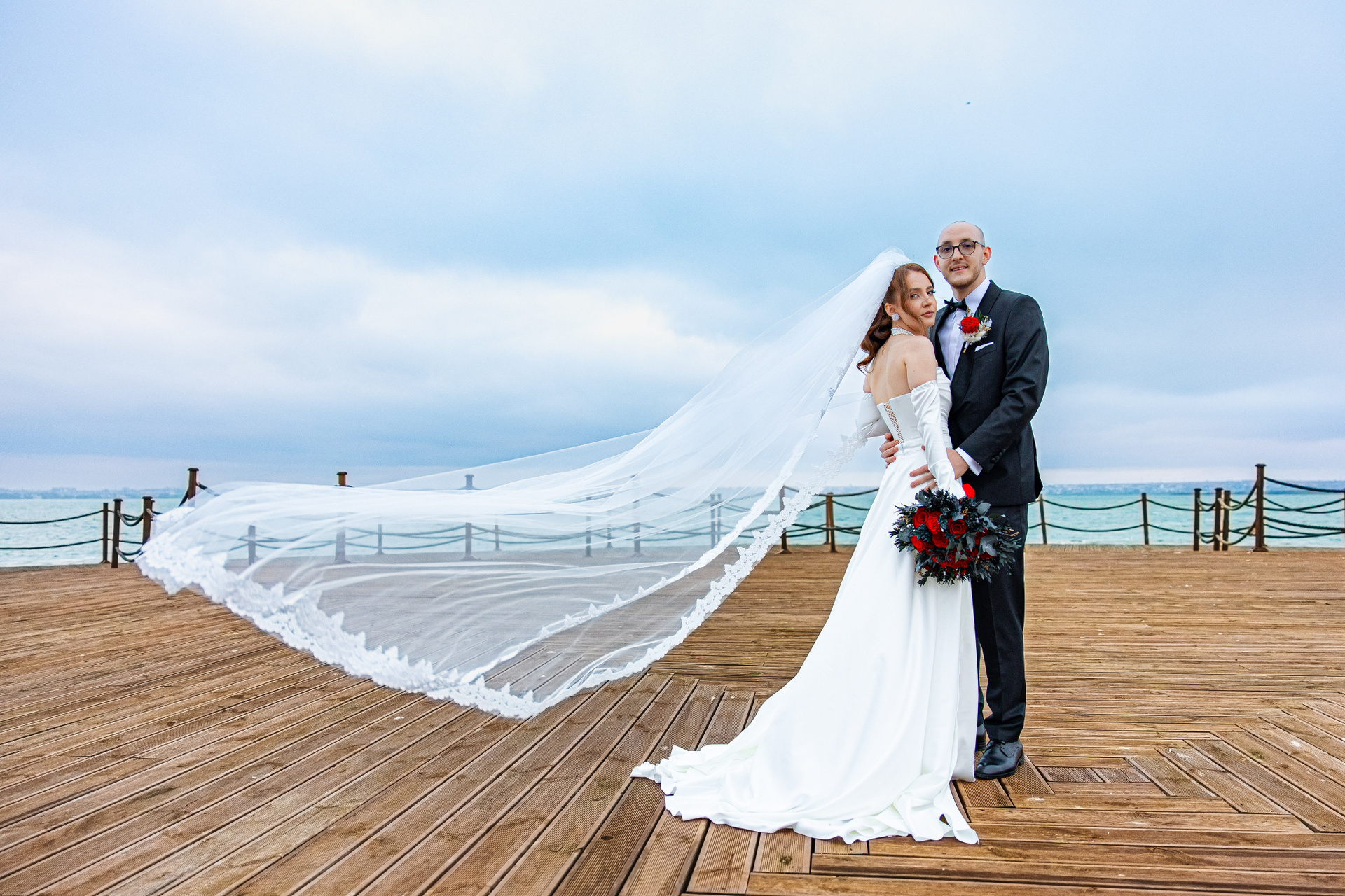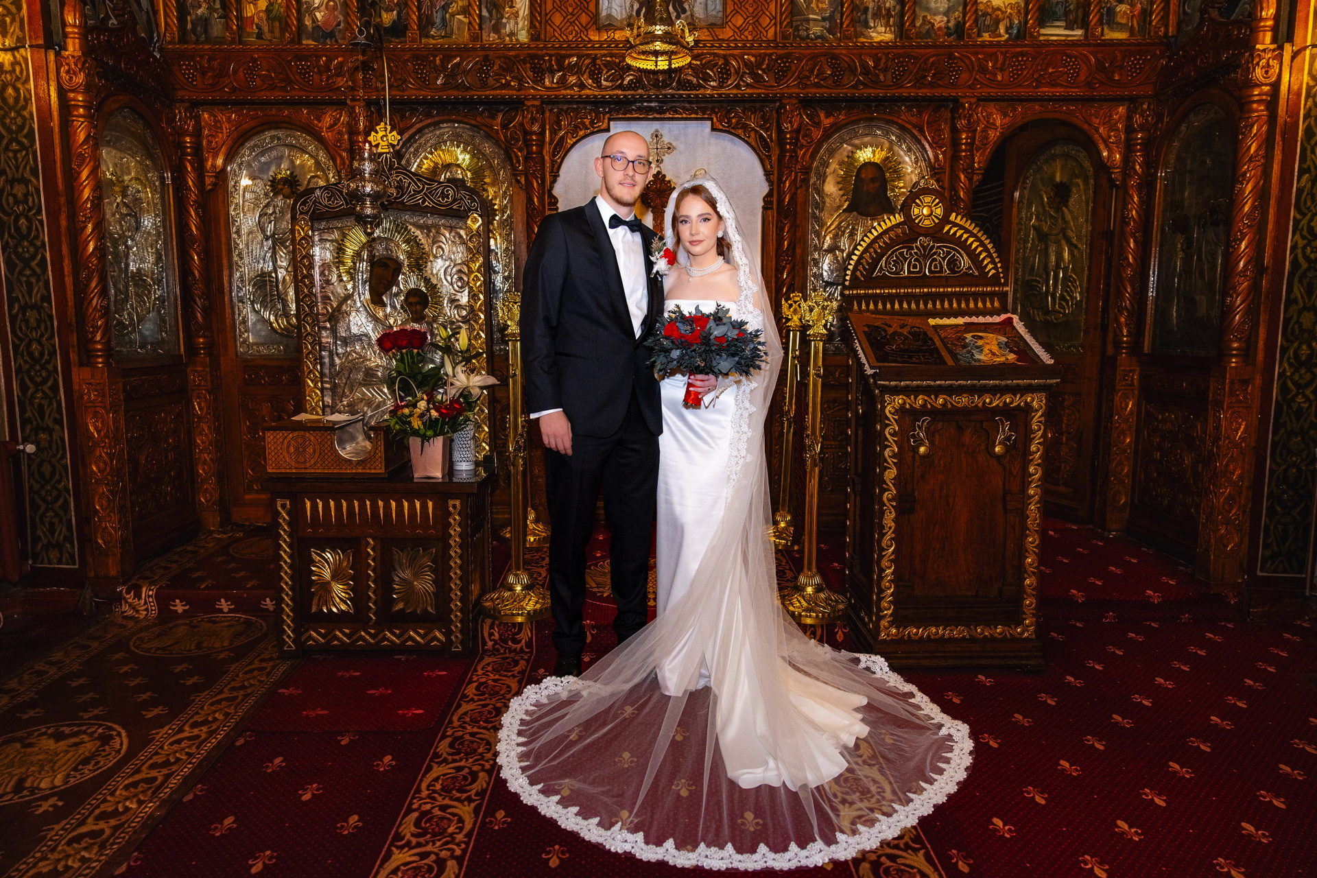 Mireasă cu voalul ridicat, alături de mire în costum albastru, portret de studio