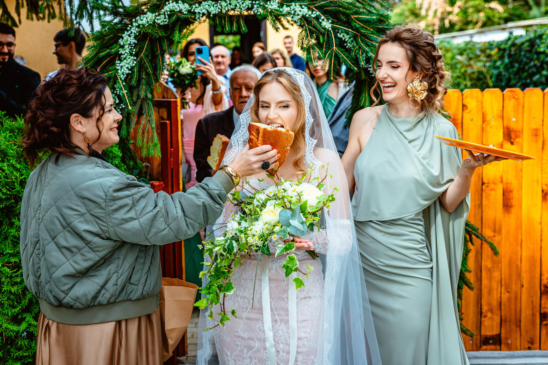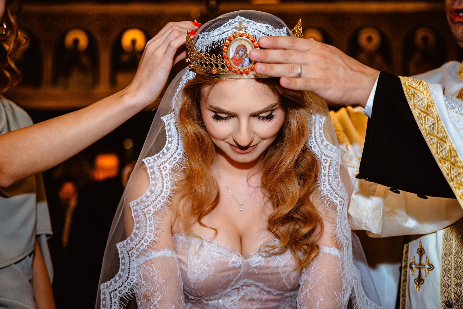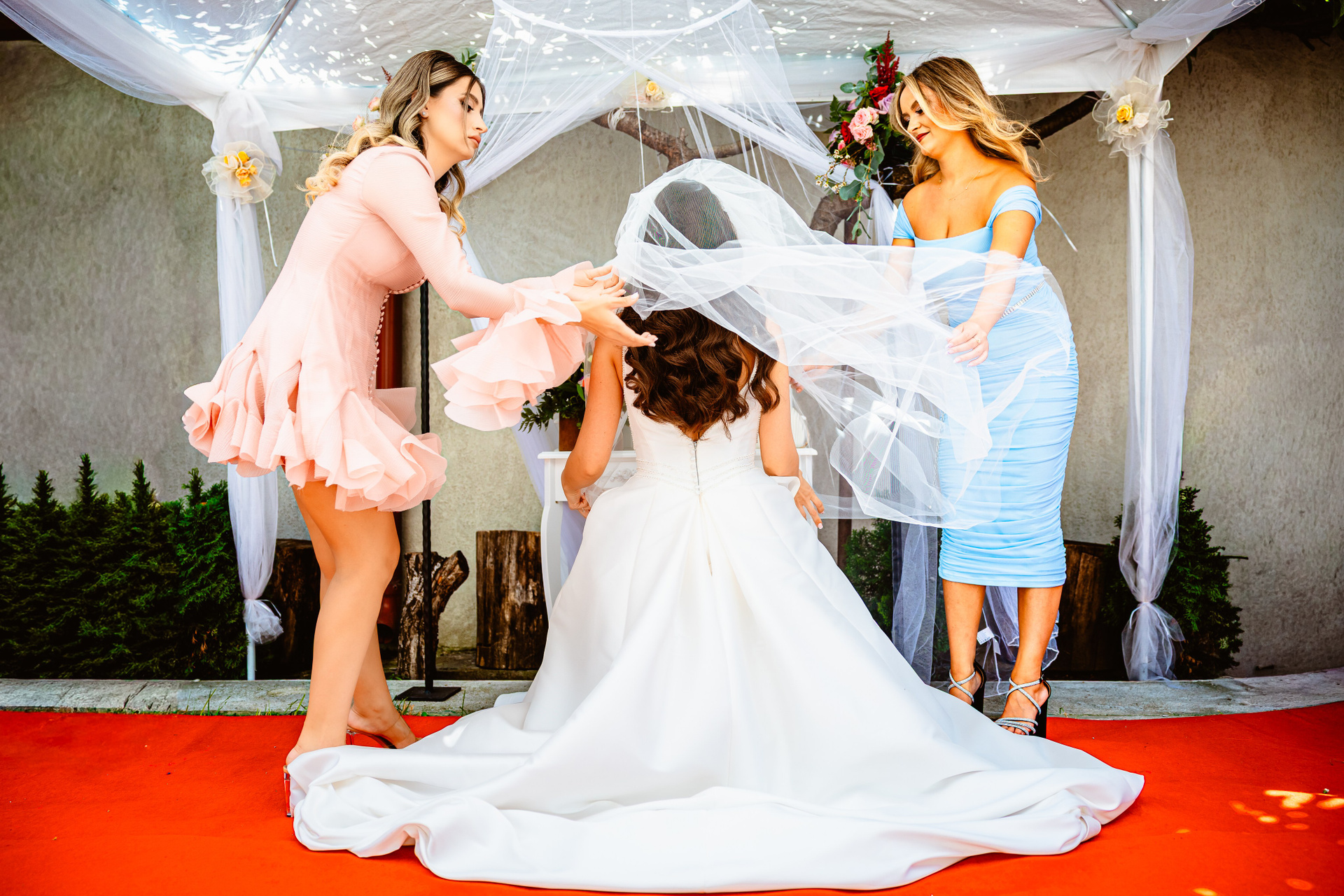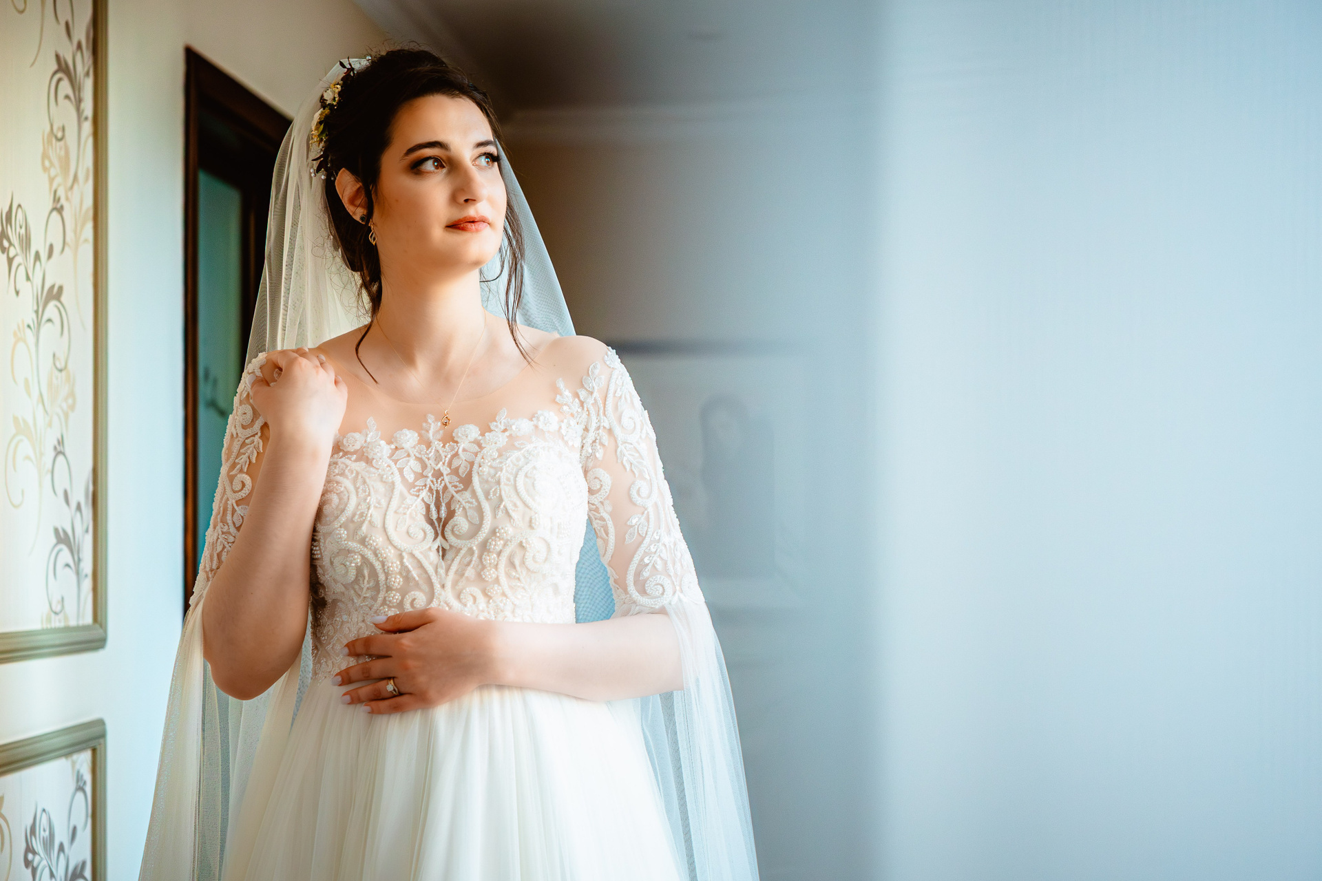 Mireasă în rochie de dantelă albă, cu voal lung desfășurat, pozând elegant