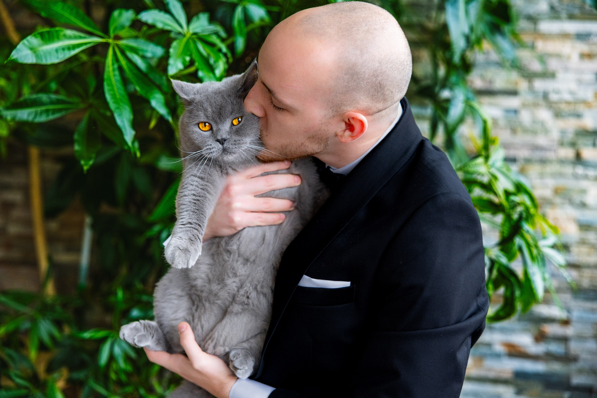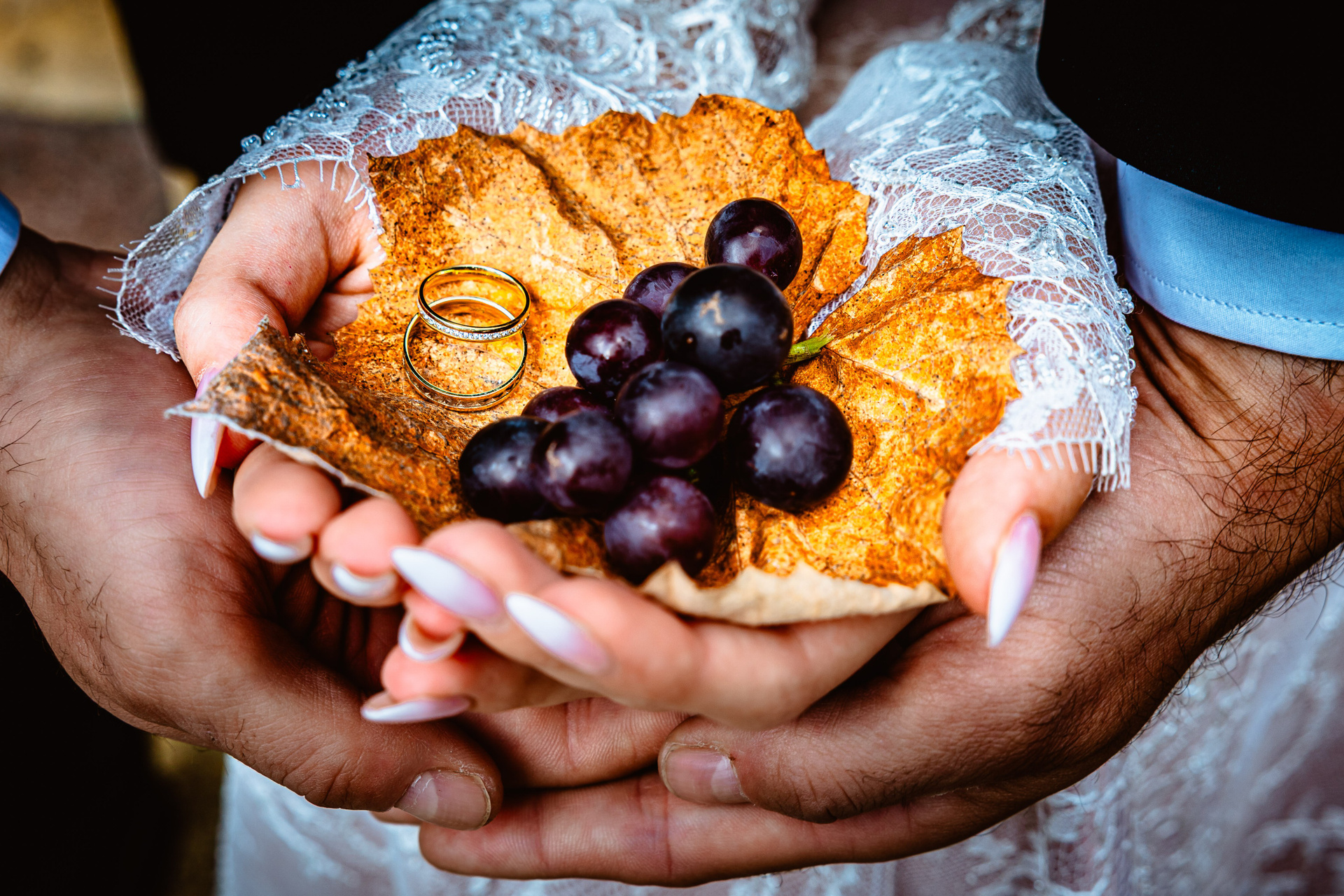 Cuplu în ținută formală, ținându-se de mână, în fața unui perete texturat