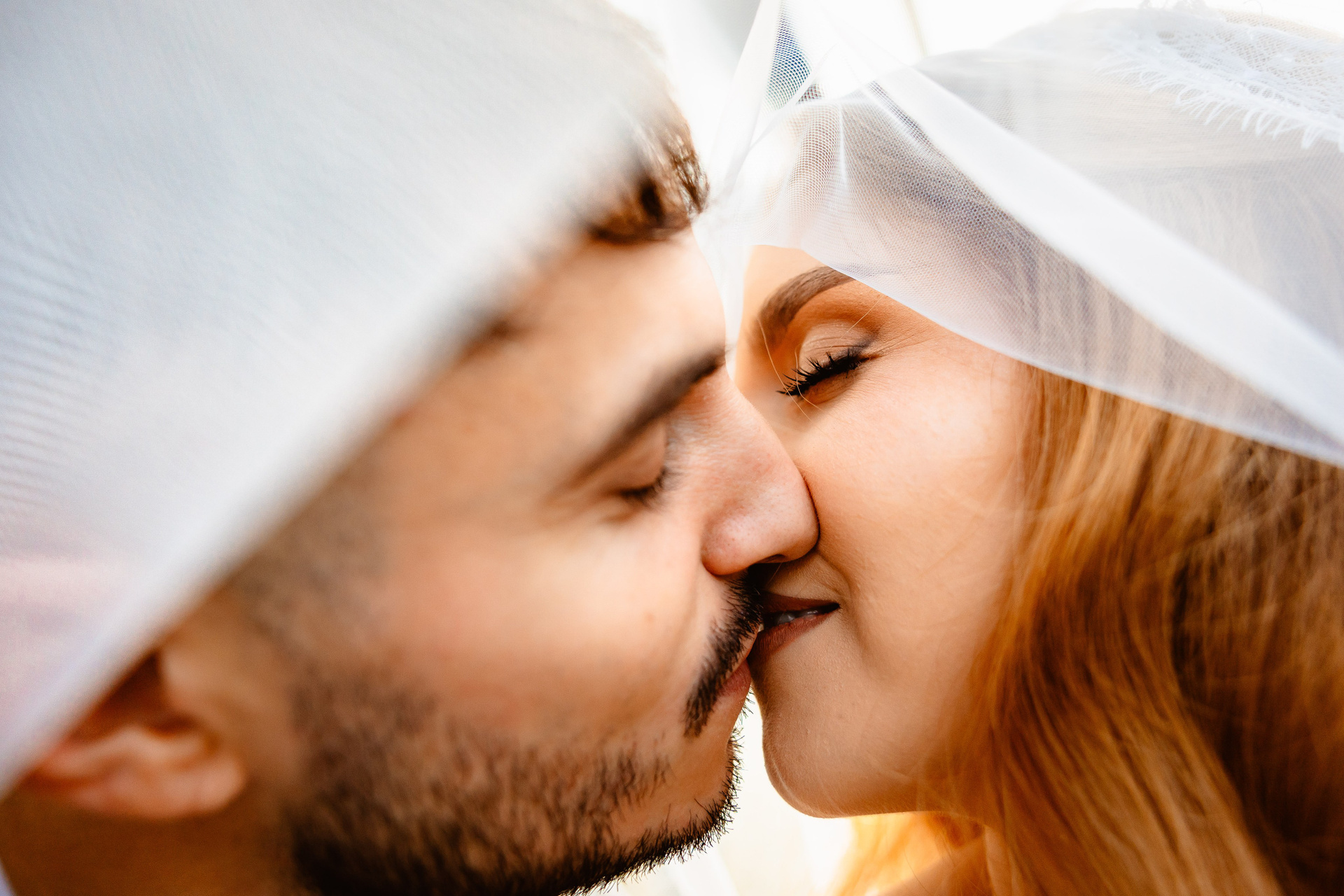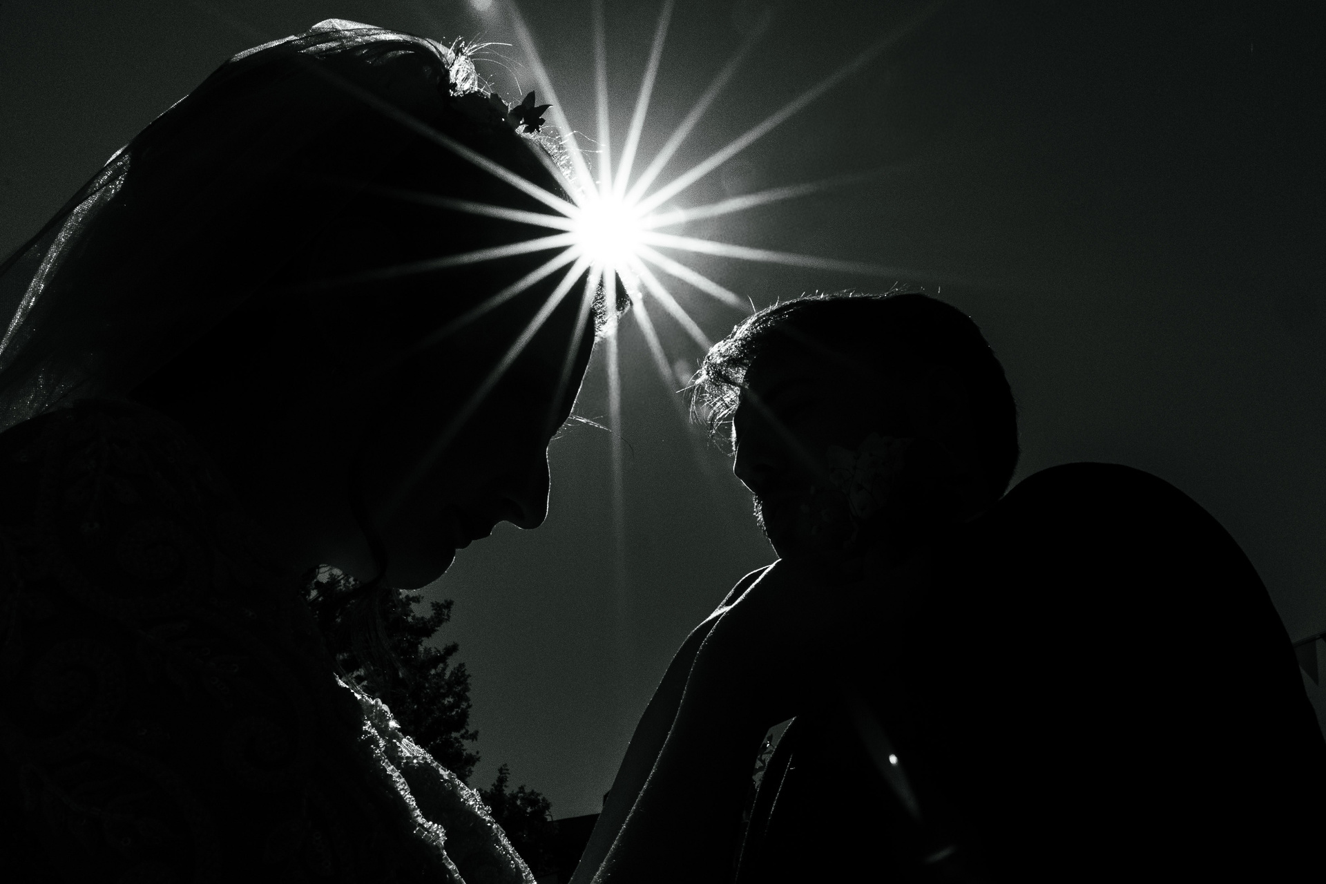 Mire cu ochii acoperiți de voalul miresei, fotografie artistică alb-negru