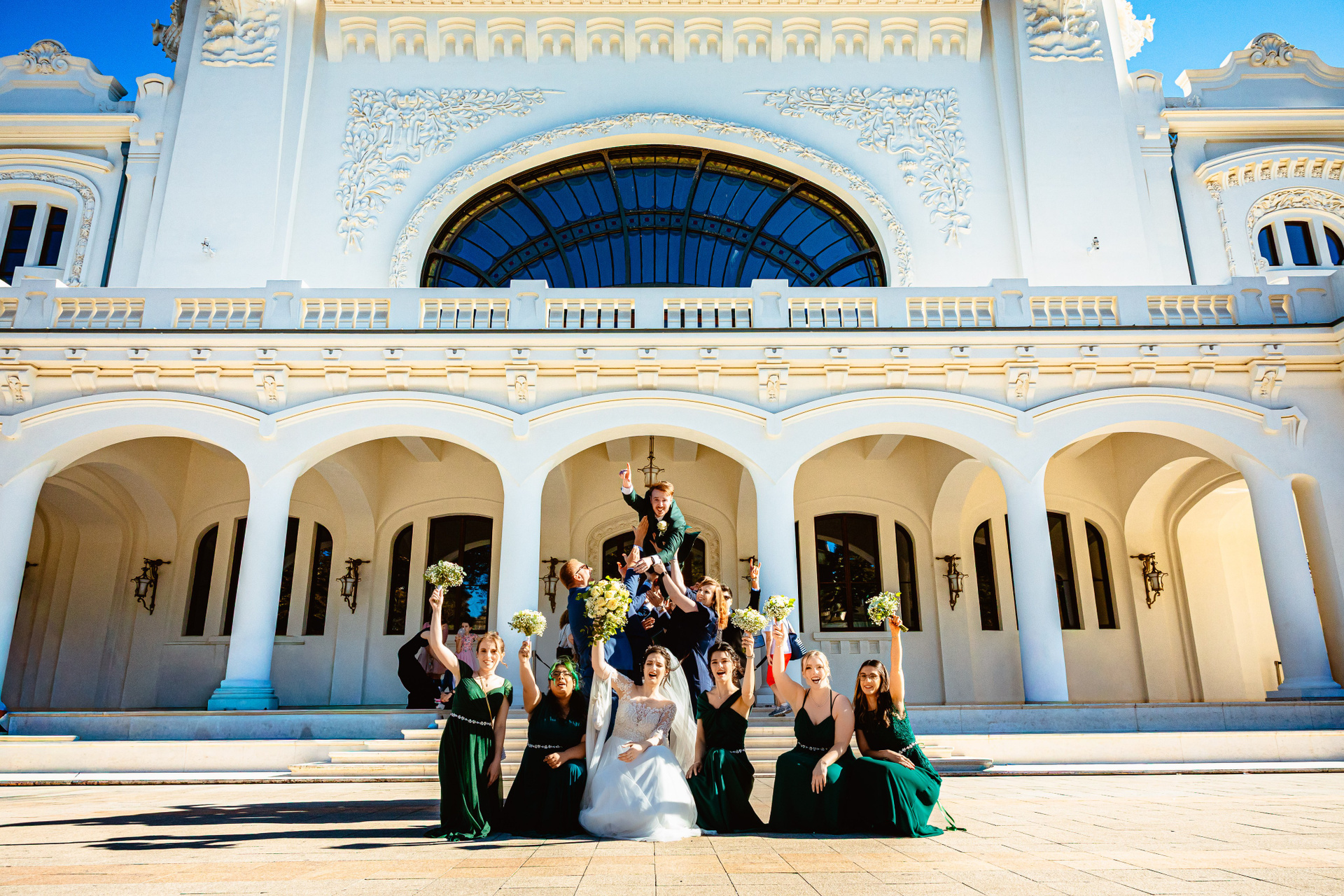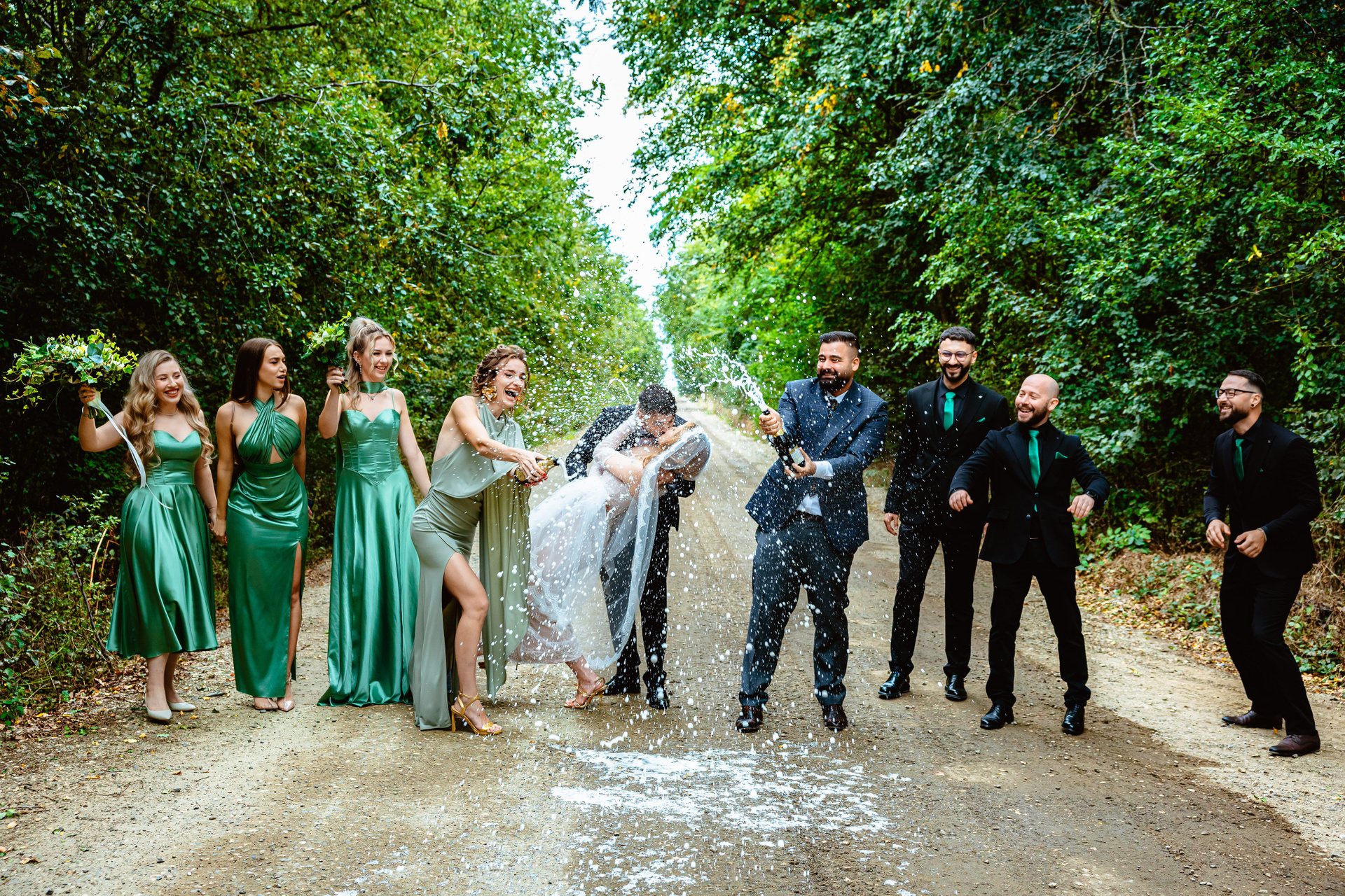 Mire și mireasă în studio, cu fundal verde, într-un moment elegant
