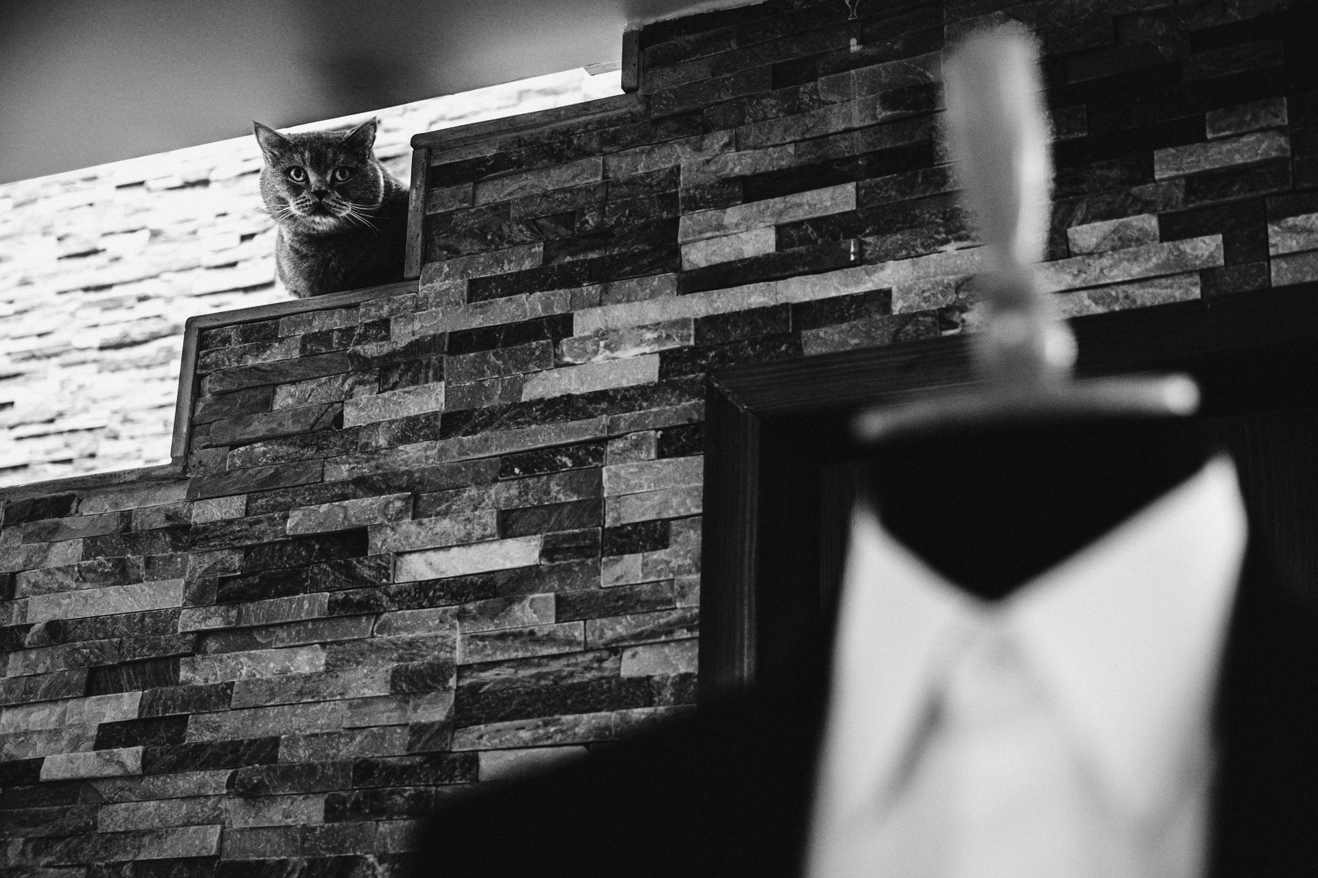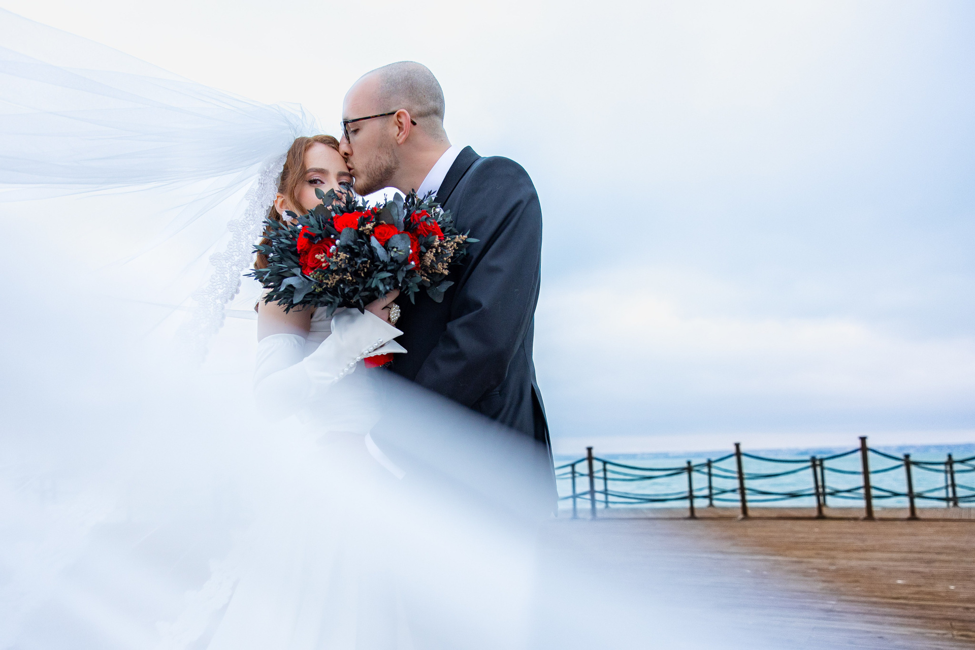 Mire și mireasă pe balcon, în zi mohorâtă, imagine alb-negru emoțională