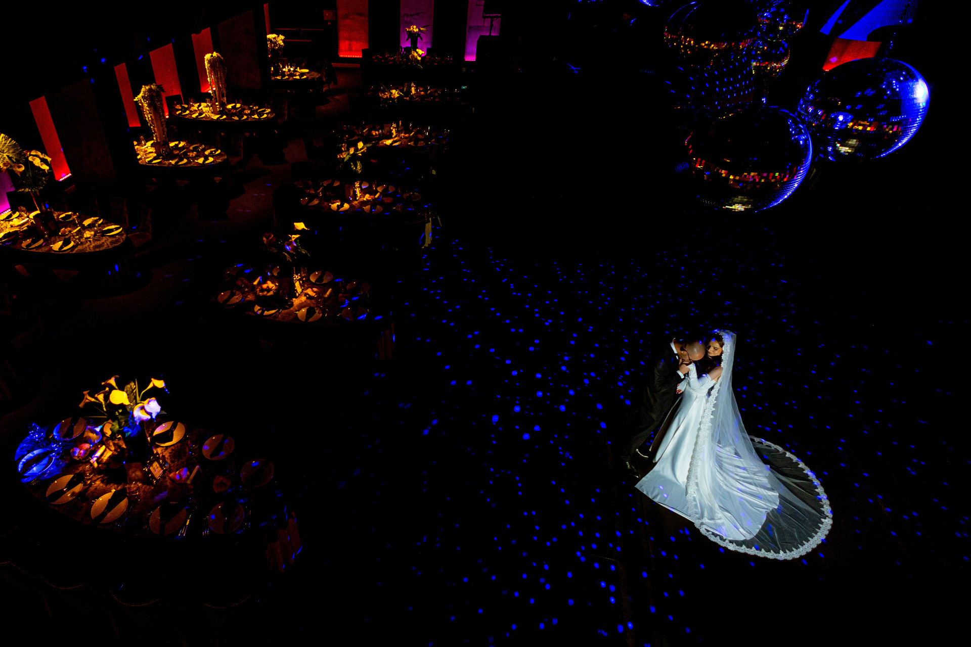 Portret creativ de mireasă reflectată într-un tavan geometric albastru