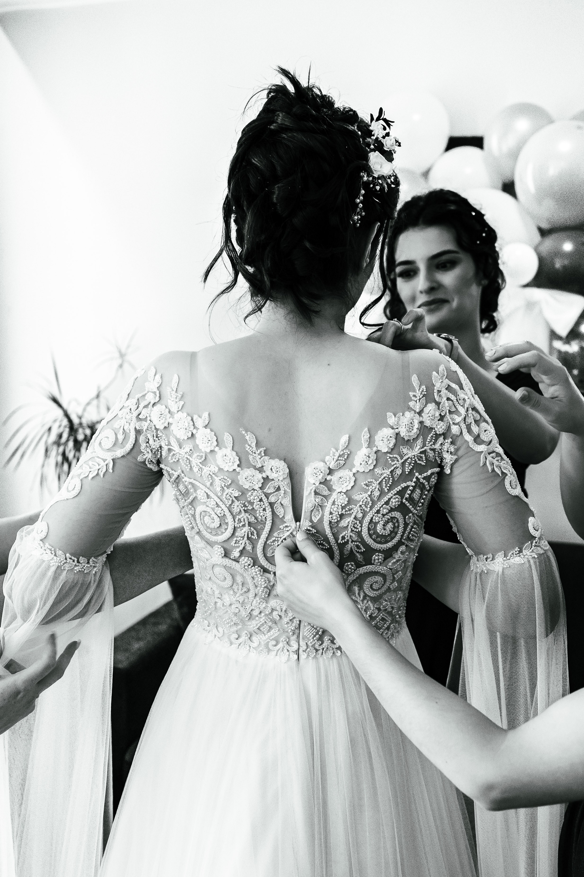Mire și mireasă în rochie cu detalii translucide, fotografie clasică alb-negru