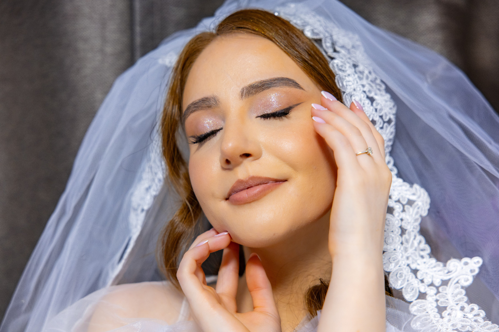 Cuplu îmbrățișat romantic, mireasa purtând o rochie decorată cu cristale, fundal cald marmorat